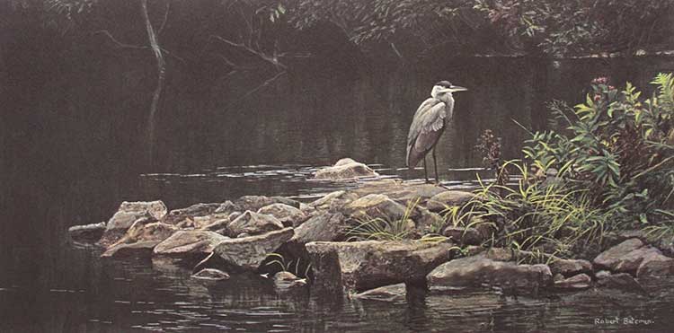 “At the bend in the river, the great blue heron rests on the rocky point. It is a full-grown juvenile, wearing a dusky cap instead of the white cap and the black cheek patch of the adult. Even though he is now on his own, he knows that this is a good place to fish.” – Robert Bateman