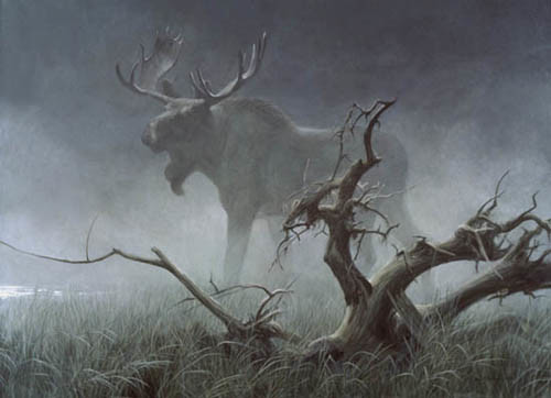 “On a moonlit night, the bull moose pauses at a swampy lake. Because it is rutting season, he is very on edge. He turns suddenly, perhaps he has heard something. To me, the upturned spruce root echoes his antlers.” – Robert Bateman
